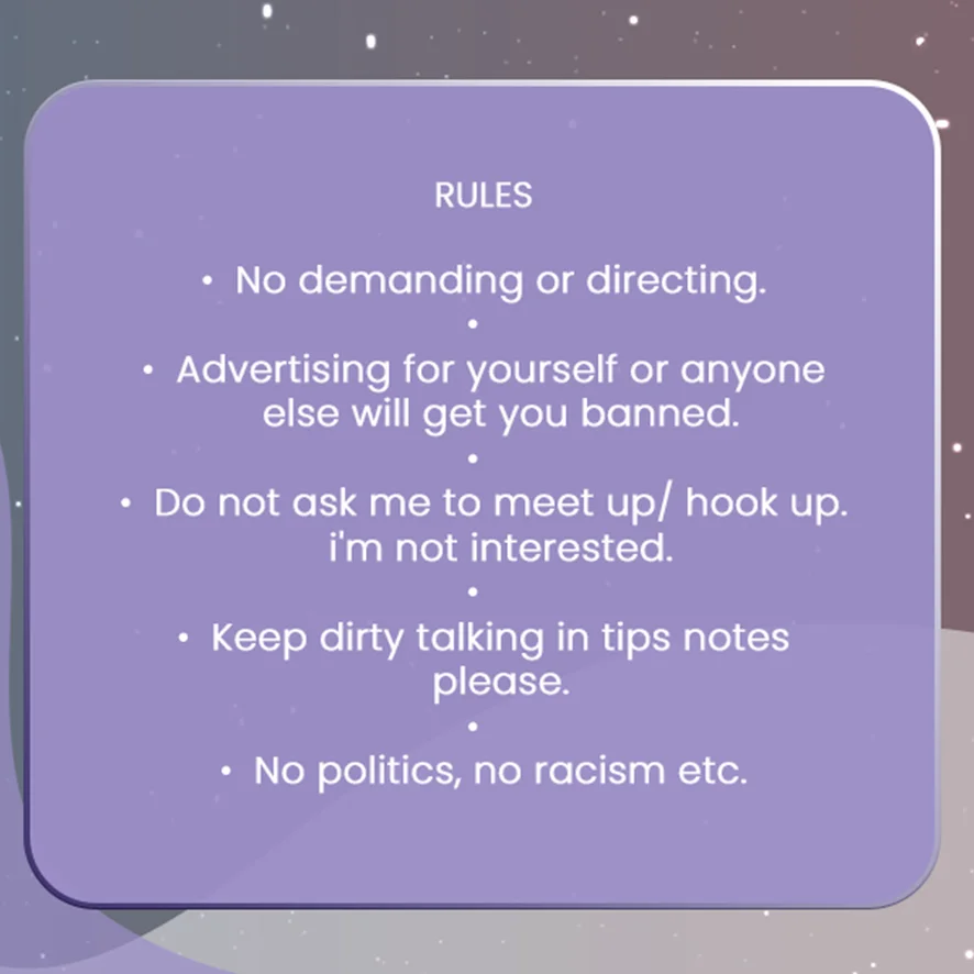 Ahegao, Plieskanie po zadku, Erotický tanec, Exhibicionizmus, Twerk, Striptíz, Odzadu, Cosplay, Prstovanie, Dildo alebo vibrátor, Sprosté reči, Podpätky, Striekanie, Olejová šou, Orgazmus, Foot fetiš, Výstrek na tvár, Fajčenie, Ponižovanie, Roleplay, Sexuálne hračky, Medzi kozy, Creampie, Hračky na bradavky, Dusenie, Hore bez