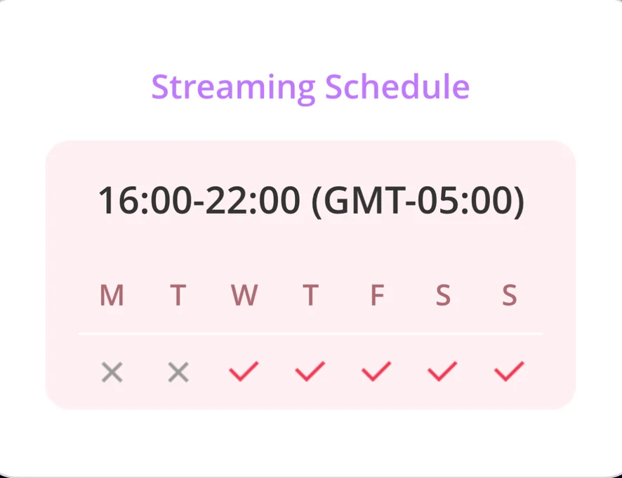 My usual streaming schedule, I'm open to connect another time if you are interested into take me Pvt, we can talk about it.